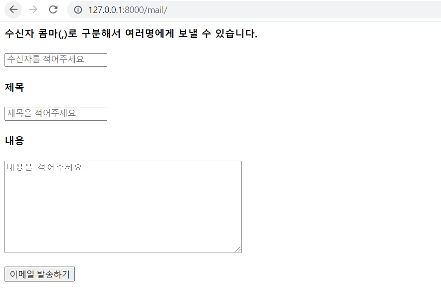 이와 같이 함수를 구현하고 다시 이메일 발송하기 버튼을 클릭하면, 입력한 문자열이 사라지는 것 외에 아무 변화가 없는 것처럼 localhost/mail 부분의 화면이 보일 것입니다.